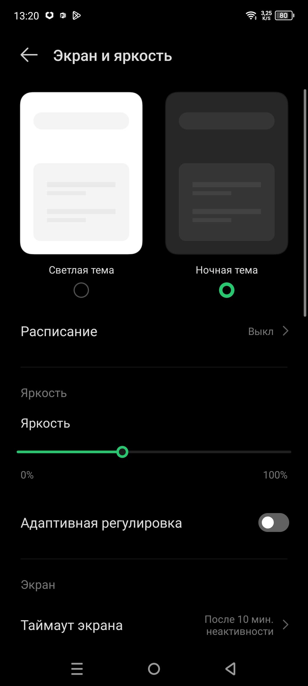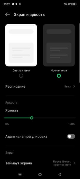 При ручном управлении яркостью и при выводе белого поля во весь экран максимальное значение яркости составило примерно 485 кд/м². Максимальная яркость высокая. В данном случае чем меньше площадь белого на экране, тем он светлее, то есть фактическая максимальная яркость белых участков будет почти всегда еще выше. В итоге, учитывая отличные антибликовые свойства, читаемость днем на солнце, должна быть на приемлемом уровне, а темная тема не только экономит заряд аккумулятора, но способствует лучшей разборчивости информации на экране в условиях высокой освещенности. Минимальное значение яркости при ручном управлении — 5 кд/м², то есть пониженный уровень яркости без проблем позволяет использовать устройство даже в полной темноте. Есть автоматическая регулировка яркости по датчику освещенности (он находится на фронтальной панели близко к ее верхнему краю правее решетки фронтального громкоговорителя). В автоматическом режиме при изменении внешних условий освещенности яркость экрана как повышается, так и понижается. Работа этой функции зависит от положения ползунка регулировки яркости: им пользователь может попытаться выставить желаемый уровень яркости в текущих условиях. Если оставить все по умолчанию, то в полной темноте функция автояркости уменьшает яркость до 5 кд/м² (темновато), в условиях освещенного искусственным светом офиса (примерно 550 лк) устанавливает на 120 кд/м² (нормально), а условно под прямыми лучами солнца повышает до 485 кд/м² (до максимума, так и нужно). Результат по умолчанию нас не удовлетворил, поэтому мы попробовали повысить яркость в полной темноте. Яркость стала выше, но после цикла повышения внешней освещенности и ее снижения, все вернулось к тем же значениям, что были до вмешательства. Получается, что функция автоподстройки яркости работает более-менее адекватно, но не позволяет пользователю настраивать свою работу под индивидуальные требования.