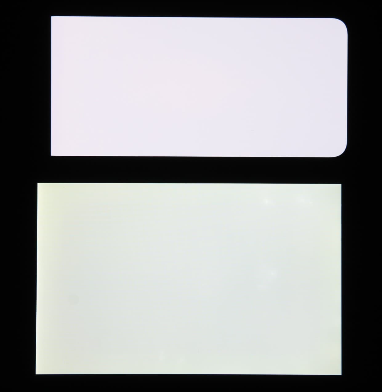 Экран характеризуется великолепными углами обзора. Правда, белый цвет при отклонении даже на небольшие углы поочередно приобретает легкий сине-зеленый или розоватый оттенок, но черный цвет остается просто черным под любыми углами. Он настолько черный, что параметр контрастности в данном случае просто неприменим. Для сравнения приведем фотографии, на которых на экраны смартфона и второго участника (Nexus 7; снизу — Nexus 7, сверху — смартфон, далее их можно различать по размеру) выведены одинаковые изображения, при этом яркость экранов изначально установлена примерно на 200 кд/м², а цветовой баланс на фотоаппарате принудительно переключен на 6500 К.