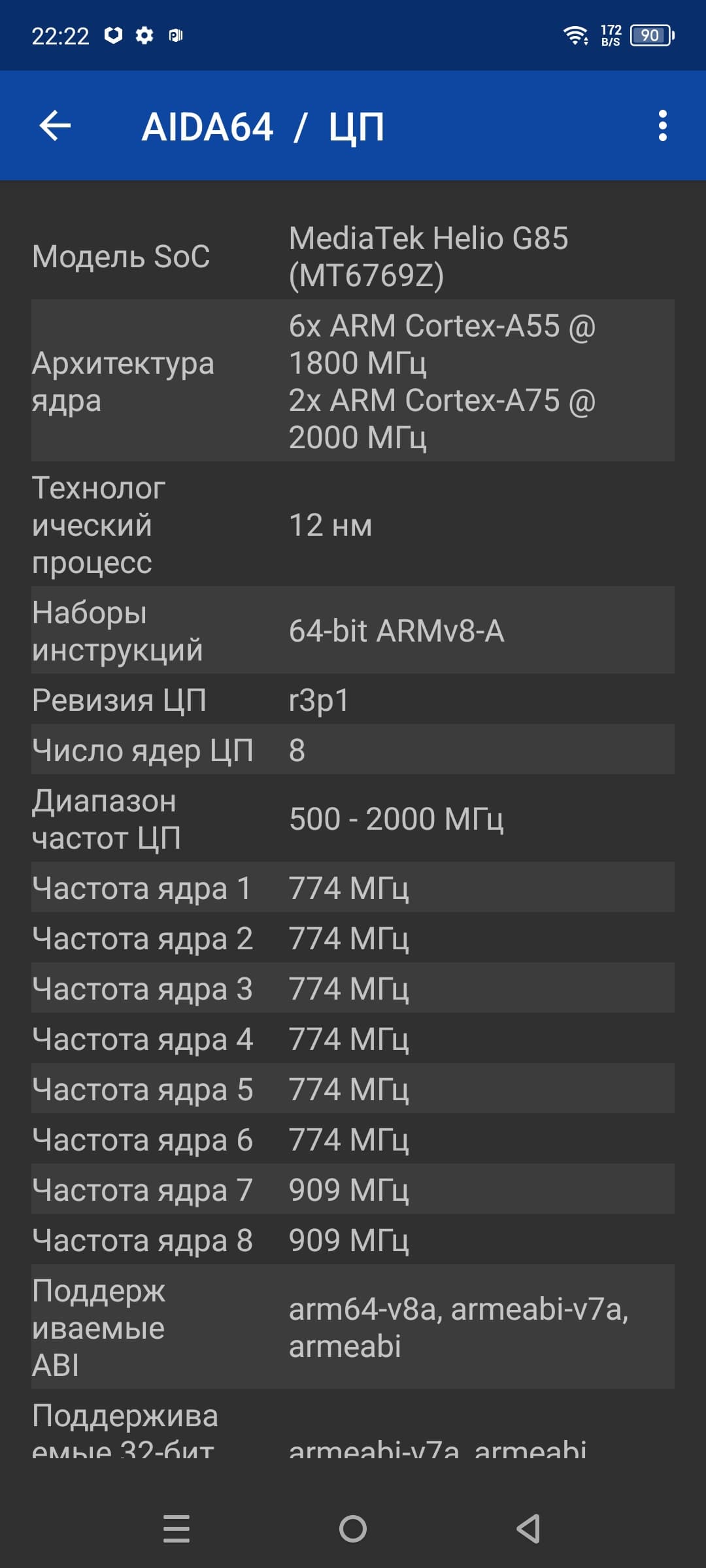 - SoC Mediatek MT6769 Helio G85 (2×Cortex-A75 @2,0 ГГц + 6×Cortex-A55 @1,8 ГГц)