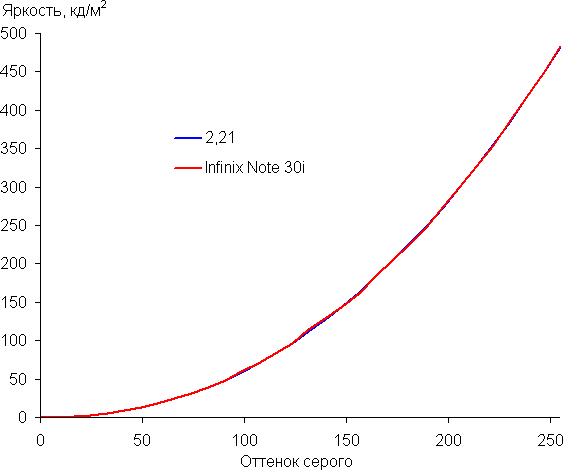Построенная по 32 точкам с равным интервалом по численному значению оттенка серого гамма-кривая не выявила завала ни в тенях, ни в светах. Показатель аппроксимирующей степенной функции равен 2,21, что близко к стандартному значению 2,2, при этом реальная гамма-кривая мало отклоняется от степенной зависимости: