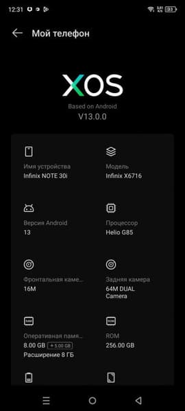 В качестве программной платформы смартфон Infinix Note 30i использует ОС Android 13 с собственной оболочкой XOS 13. Интерфейс работает плавно, без видимых задержек и притормаживаний, приложения открываются быстро. Верхняя шторка разделена на две части в зависимости от места оттягивания. Предустановлено большое количество разнообразных приложений, а также имеется свой магазин для них. Официальный магазин приложений и доступ к сервисам Google тоже на месте.