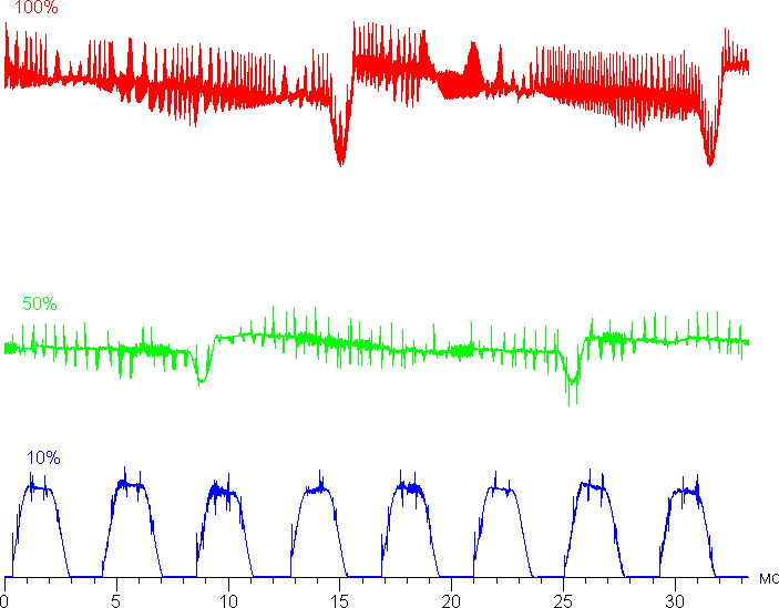 На любом уровне яркости присутствует значимая модуляция с частотой 60 или 240 Гц. На рисунке ниже приведены зависимости яркости (вертикальная ось) от времени (горизонтальная ось) для нескольких значений настройки яркости.