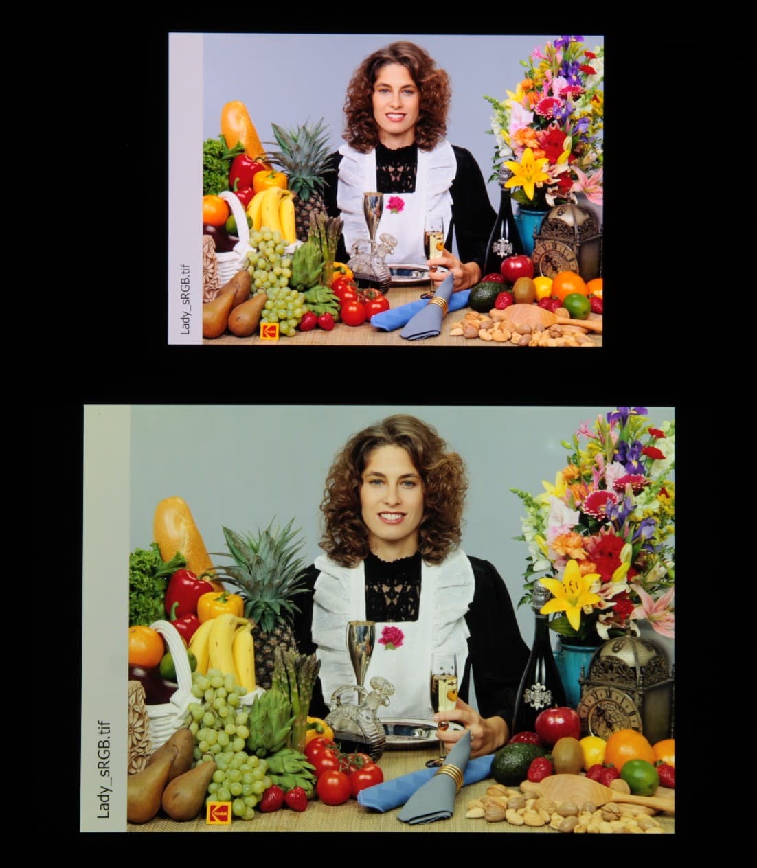 Цвета на экране смартфона перенасыщены (обратите внимание на помидоры, бананы, салфетку и оттенок лица), а цветовой баланс заметно отличается. Напомним, что фотография не может служить надежным источником сведений о качестве цветопередачи и приводится только для условной наглядной иллюстрации. В частности, выраженный красноватый оттенок белого и серого полей, присутствующий на фотографиях экрана смартфона, при перпендикулярном взгляде визуально отсутствует, что подтверждается аппаратными тестами с помощью спектрофотометра. Причина в том, что спектральная чувствительность матрицы фотоаппарата неточно совпадает с этой характеристикой человеческого зрения.