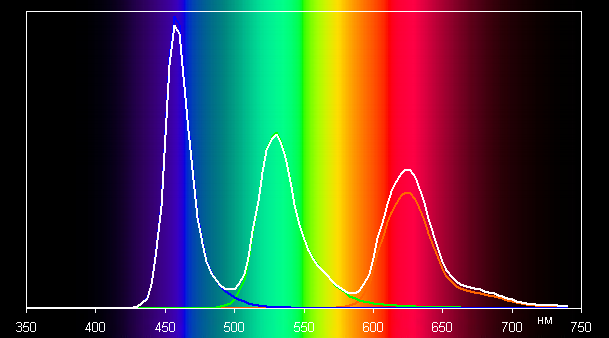 Спектры компонент (то есть спектры чистых красного, зеленого и синего цветов) очень хорошо разделены:
