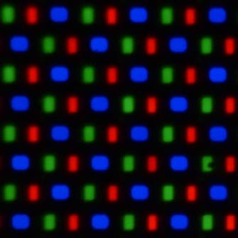 В этом экране используется матрица AMOLED — активная матрица на органических светодиодах. Полноцветное изображение создается с помощью субпикселей трех цветов — красного, зеленого и синего в равном количестве. Это подтверждается фрагментом микрофотографии: