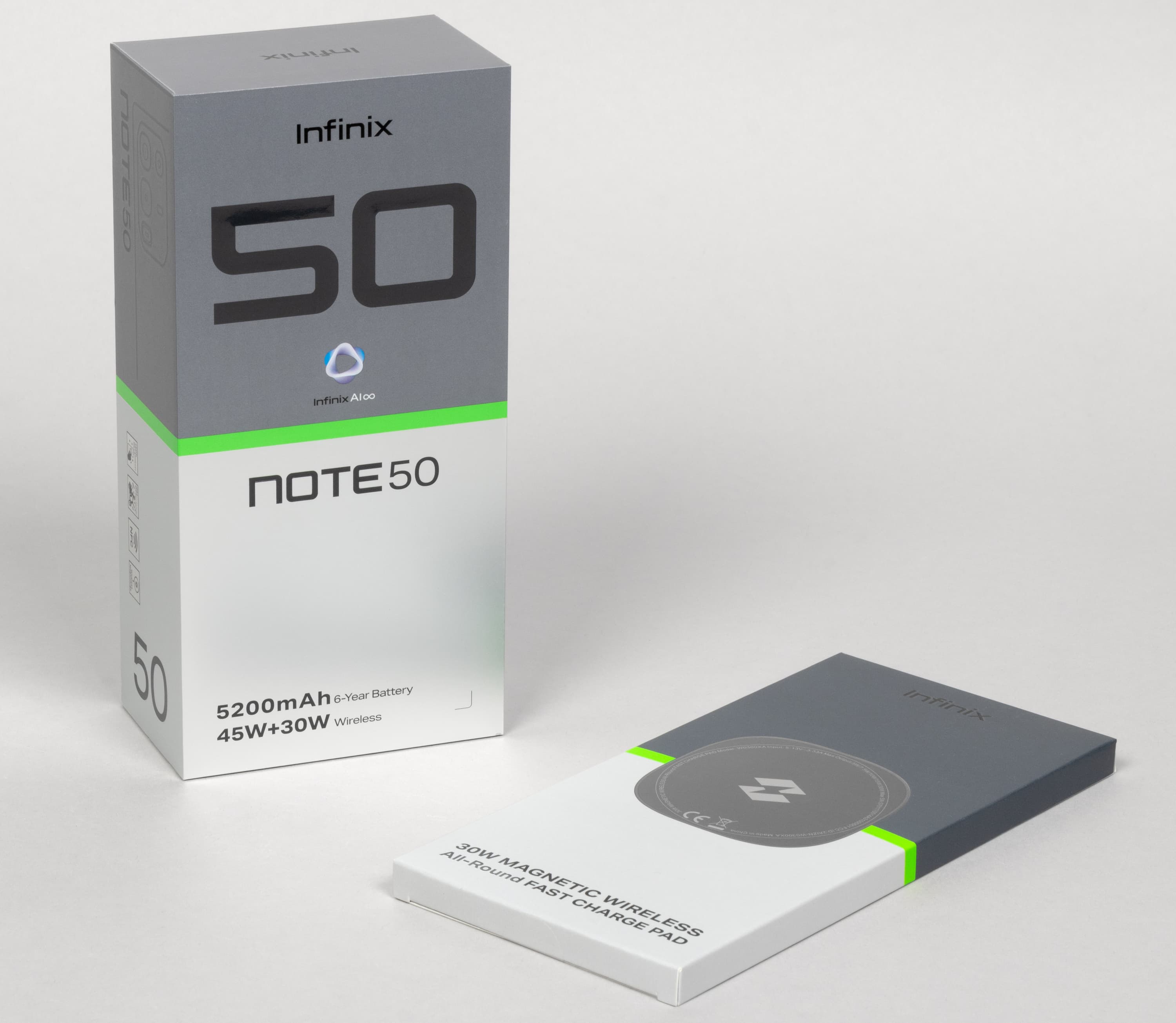 Смартфон Infinix Note 50 поставляется в нестандартной картонной упаковке, состоящей из двух отдельных коробок, объединенных одной суперобложкой.