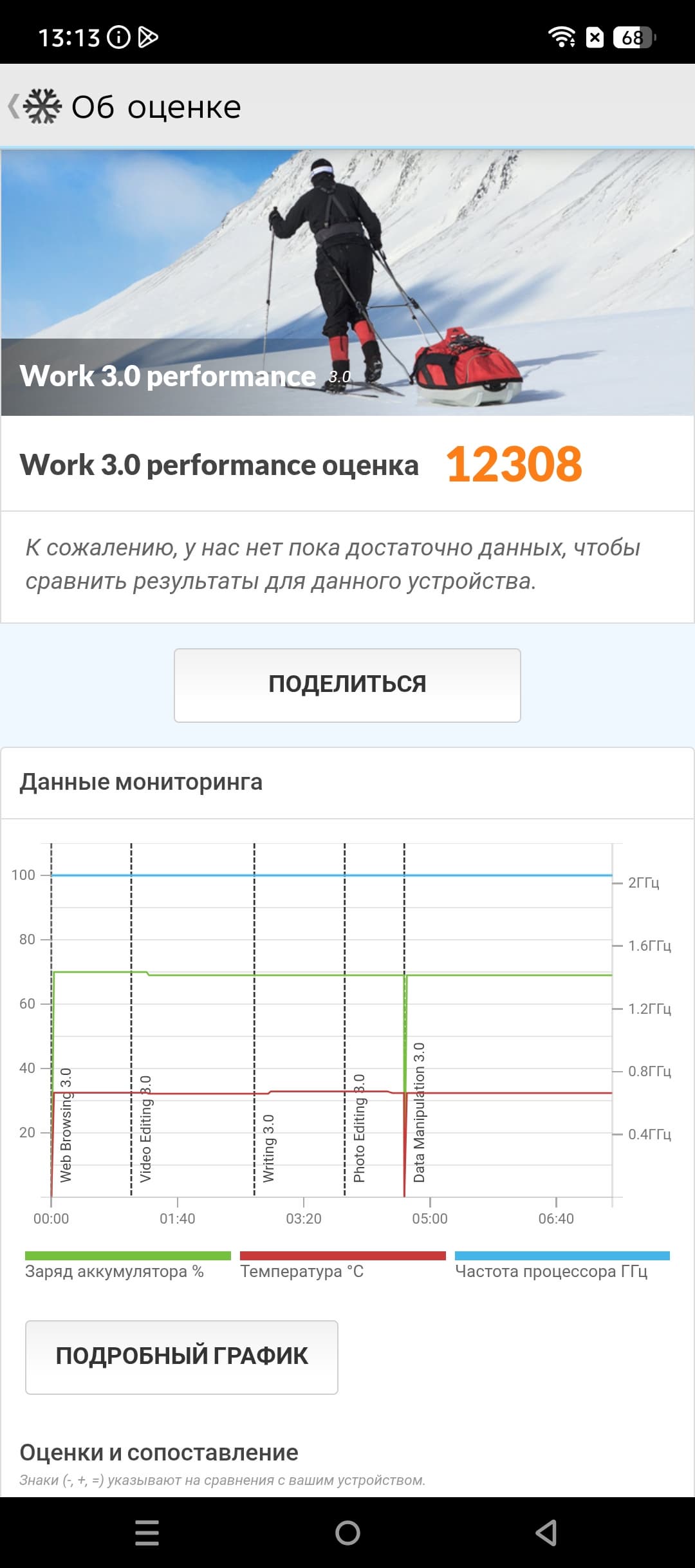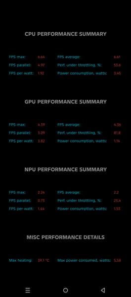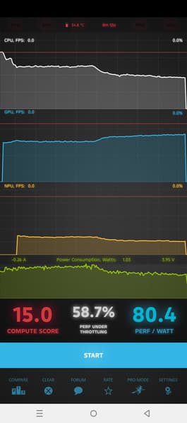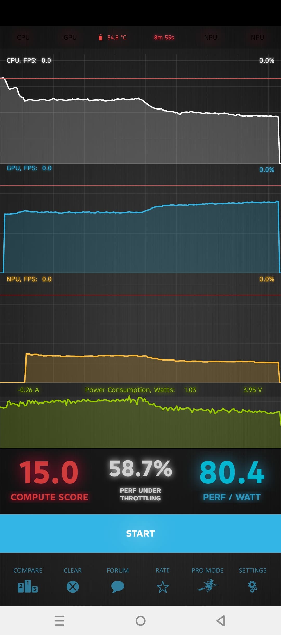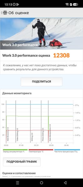 Тест на снижение производительности при нагреве мы проводим с помощью программы Burnout Benchmark, которая позволяет нагружать CPU, GPU и NPU. Вот уровень тротлинга здесь действительно очень скромный.