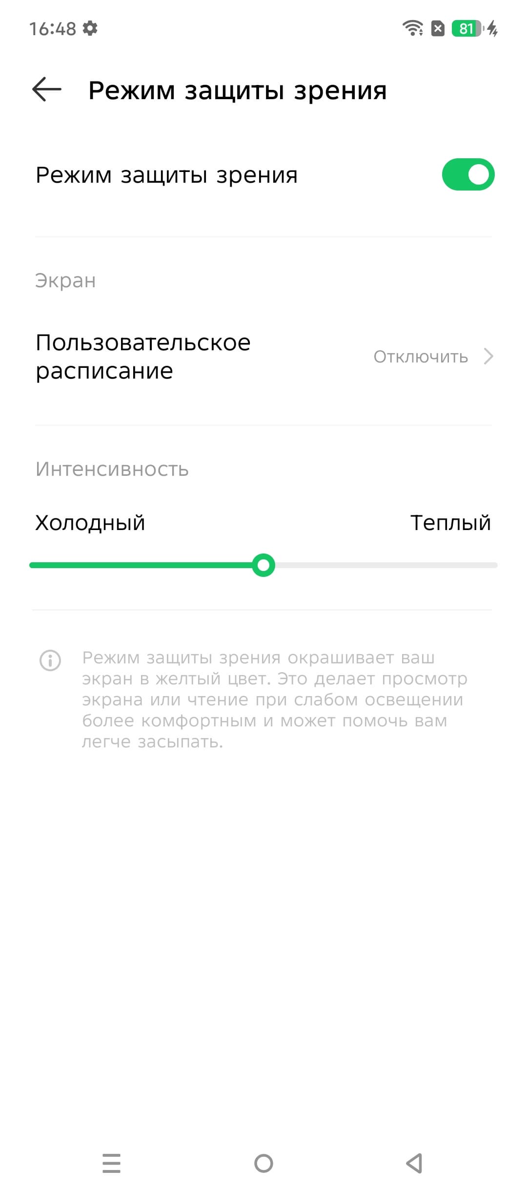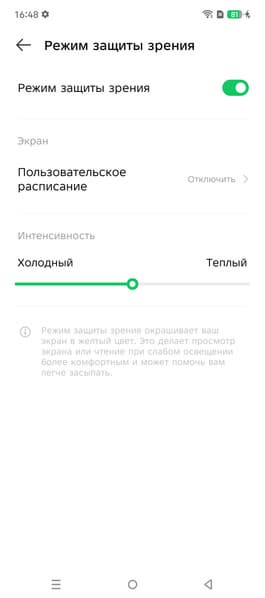 Разумеется, присутствует настройка (Режим защиты зрения), позволяющая снизить интенсивность синей компоненты. В принципе, яркий свет может приводить к нарушению суточного (циркадного) ритма (см. статью про iPad Pro с дисплеем 9,7 дюйма), но все решается снижением яркости до низкого, но еще комфортного уровня, а искажать цветовой баланс, уменьшая вклад синего, нет абсолютно никакого смысла.