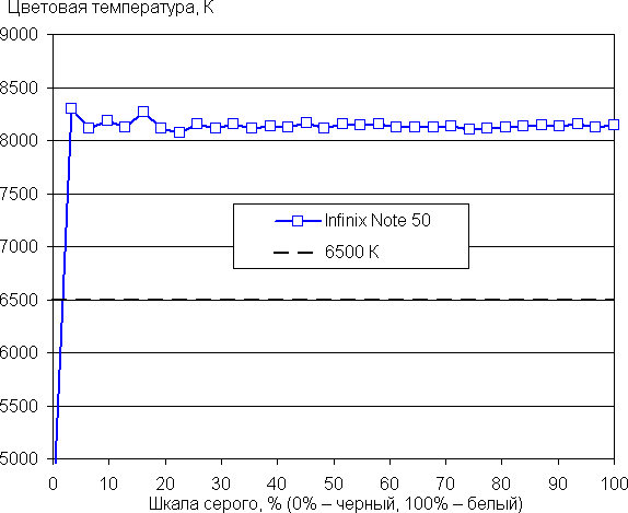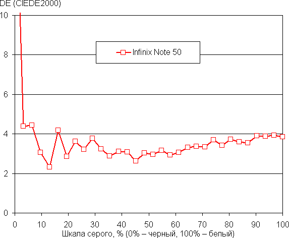 (Самые темные области шкалы серого в большинстве случаев можно не учитывать, так как там баланс цветов не имеет большого значения, да и погрешность измерений цветовых характеристик на низкой яркости большая.) В этом устройстве есть возможность скорректировать цветовой баланс регулировки цветовой температуры, но при eе снижении растет ΔE, поэтому заниматься такой коррекцией смысла нет.