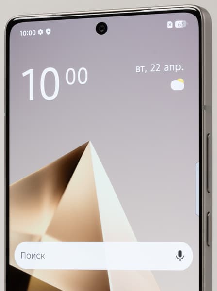 Сверху по центру за круглым вырезом в матрице экрана установлена одиночная селфи-камера. В нижней части экрана расположен дактилоскопический сканер — обычный, оптический. Срабатывает он более-менее быстро, но всё равно не быстрее емкостного.