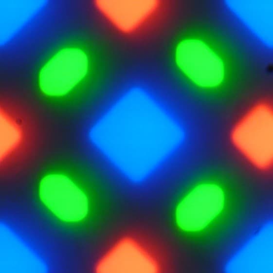 В этом экране используется матрица AMOLED — активная матрица на органических светодиодах. Полноцветное изображение создается с помощью субпикселей трех цветов — красного (R), зеленого (G) и синего (B), но красных и синих субпикселей в два раза меньше (синий субпиксель состоит из двух частей), что можно обозначить как RGBG. Это подтверждается фрагментом микрофотографии: