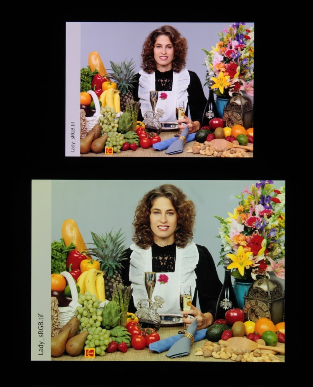 Соответственно, цветовой охват в случае изображения с профилем sRGB при выбранном профиле Яркие цвета и при выводе в ПО Галерея AI немного шире sRGB: