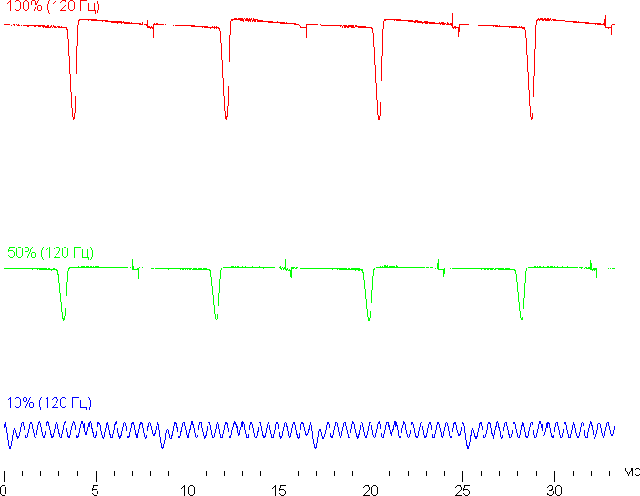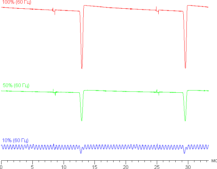 На высоком и среднем уровне яркости присутствует значимая модуляция с частотой 60 или 120 Гц. На рисунках ниже приведены зависимости яркости (вертикальная ось) от времени (горизонтальная ось) для нескольких значений настройки яркости. Сначала для режима с частотой обновления 60 Гц: