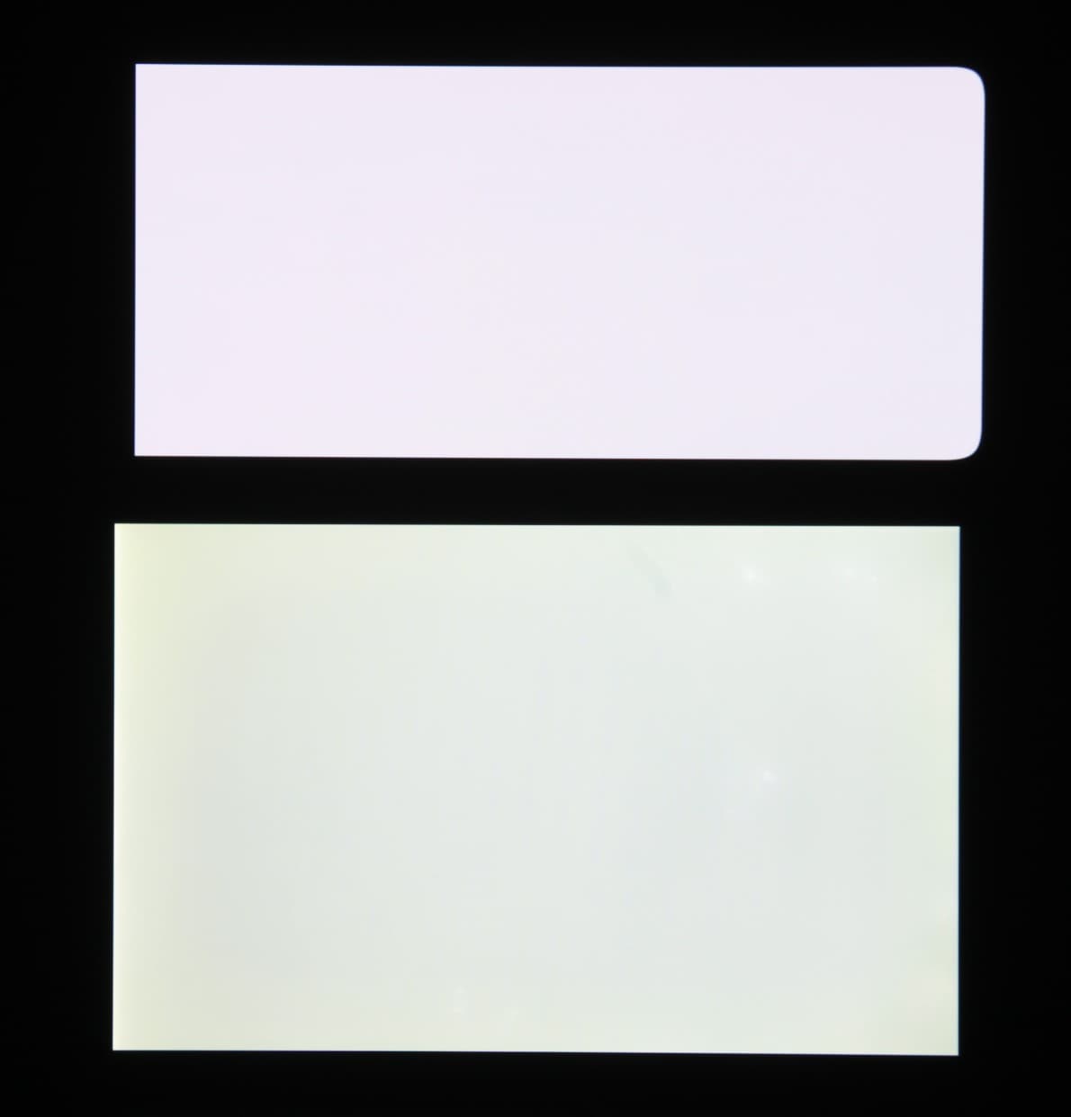 Экран характеризуется великолепными углами обзора. Яркость под углом у обоих экранов заметно уменьшается (если сравнивать с Nexus 7), но в случае смартфона падение яркости выражено гораздо меньше. В итоге, даже если установить формально одинаковую яркость, то экран этого смартфона визуально выглядит гораздо более ярким (в сравнении с ЖК-экранами), так как на экран мобильного устройства часто приходится смотреть как минимум под небольшим углом. Правда, у смартфона белый цвет при отклонении на большие углы приобретает едва заметный сине-зеленый оттенок, но черный цвет остается просто черным под любыми углами. Он настолько черный, что параметр контрастности в данном случае неприменим. Для сравнения приведем фотографии, на которых на экран смартфона и экран второго участника (Nexus 7; снизу — Nexus 7, сверху — смартфон) выведены одинаковые изображения, при этом яркость экранов изначально установлена примерно на 200 кд/м², а цветовой баланс на фотоаппарате принудительно переключен на 6500 К.