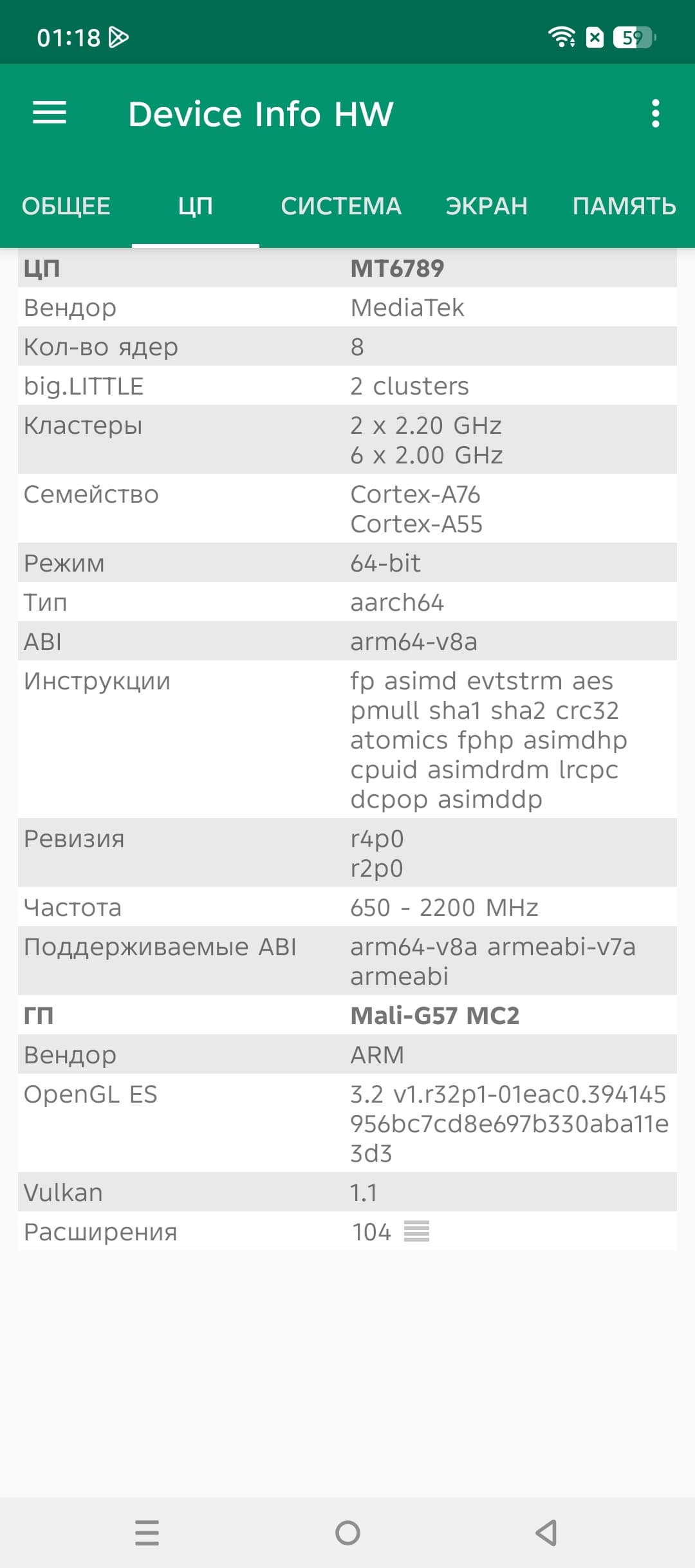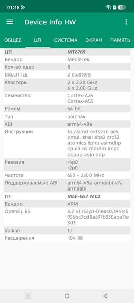 - SoC Mediatek Helio G100 Ultimate, 8 процессорных ядер (2×Cortex-A76 @2,2 ГГц + 6×Cortex-A55 @2,0 ГГц)