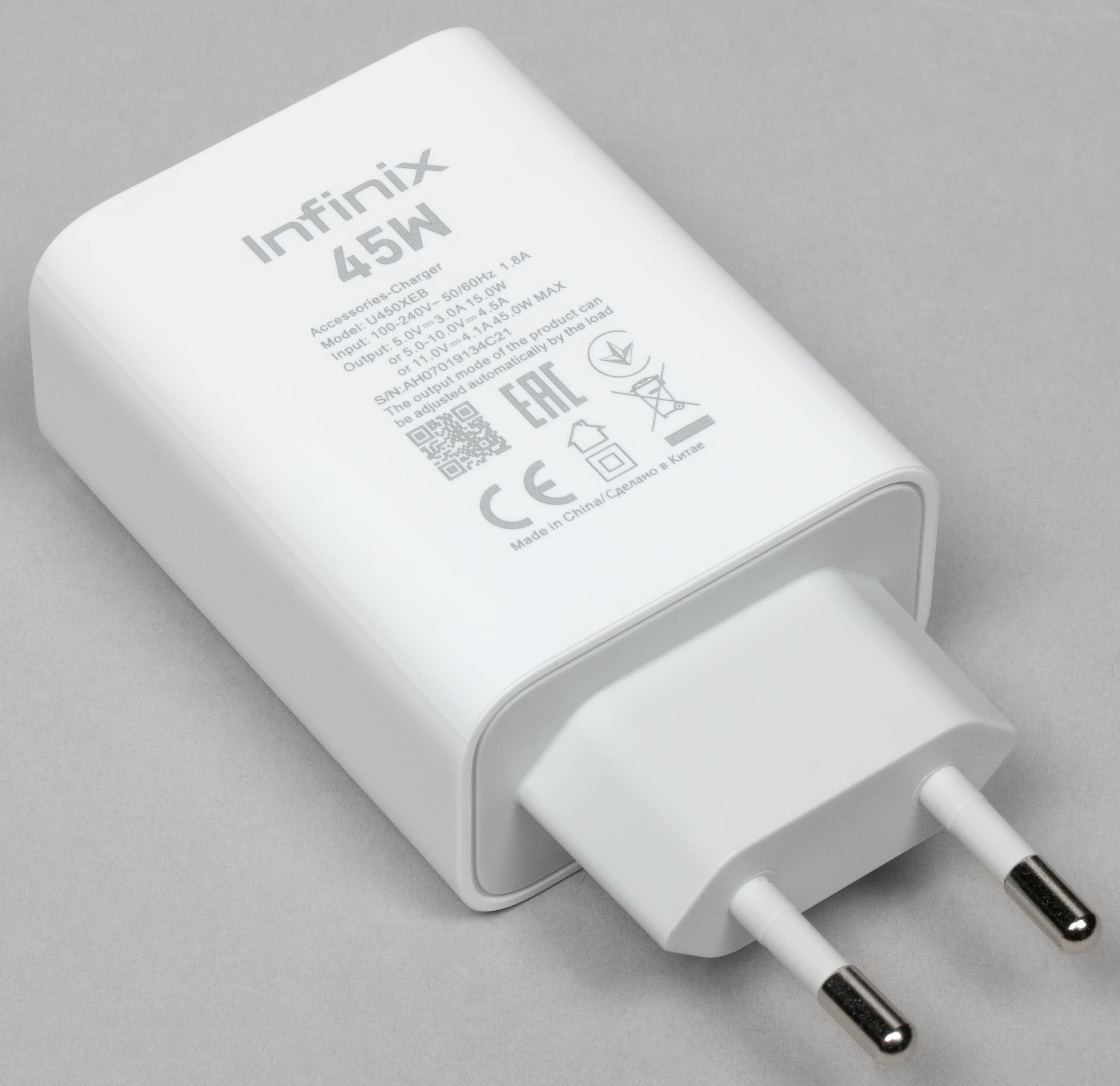 Комплект включает сетевой блок питания с максимальной выходной мощностью 45 Вт, соединительный кабель, а также защитный чехол и станцию беспроводной зарядки.
