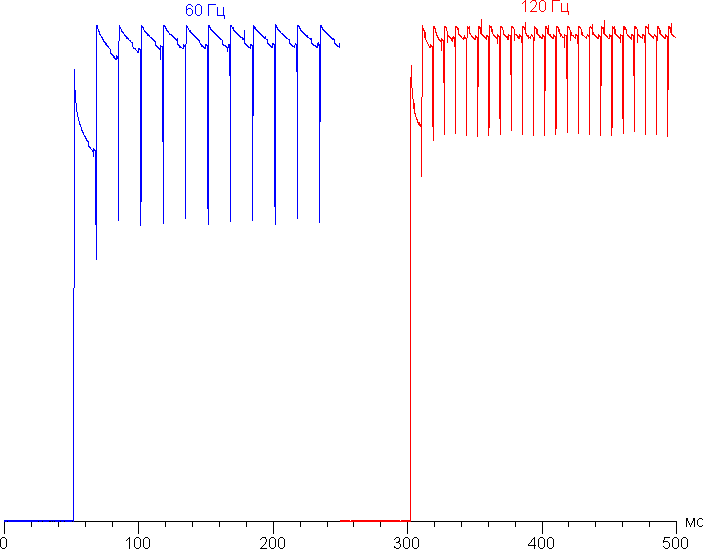 Видно, что основная частота модуляции увеличилась в 2 раза (относительно режима с 60 Гц). Видимого мерцания всё так же нет.