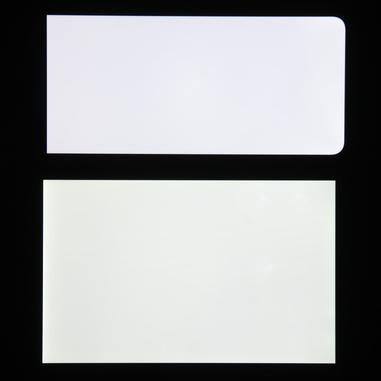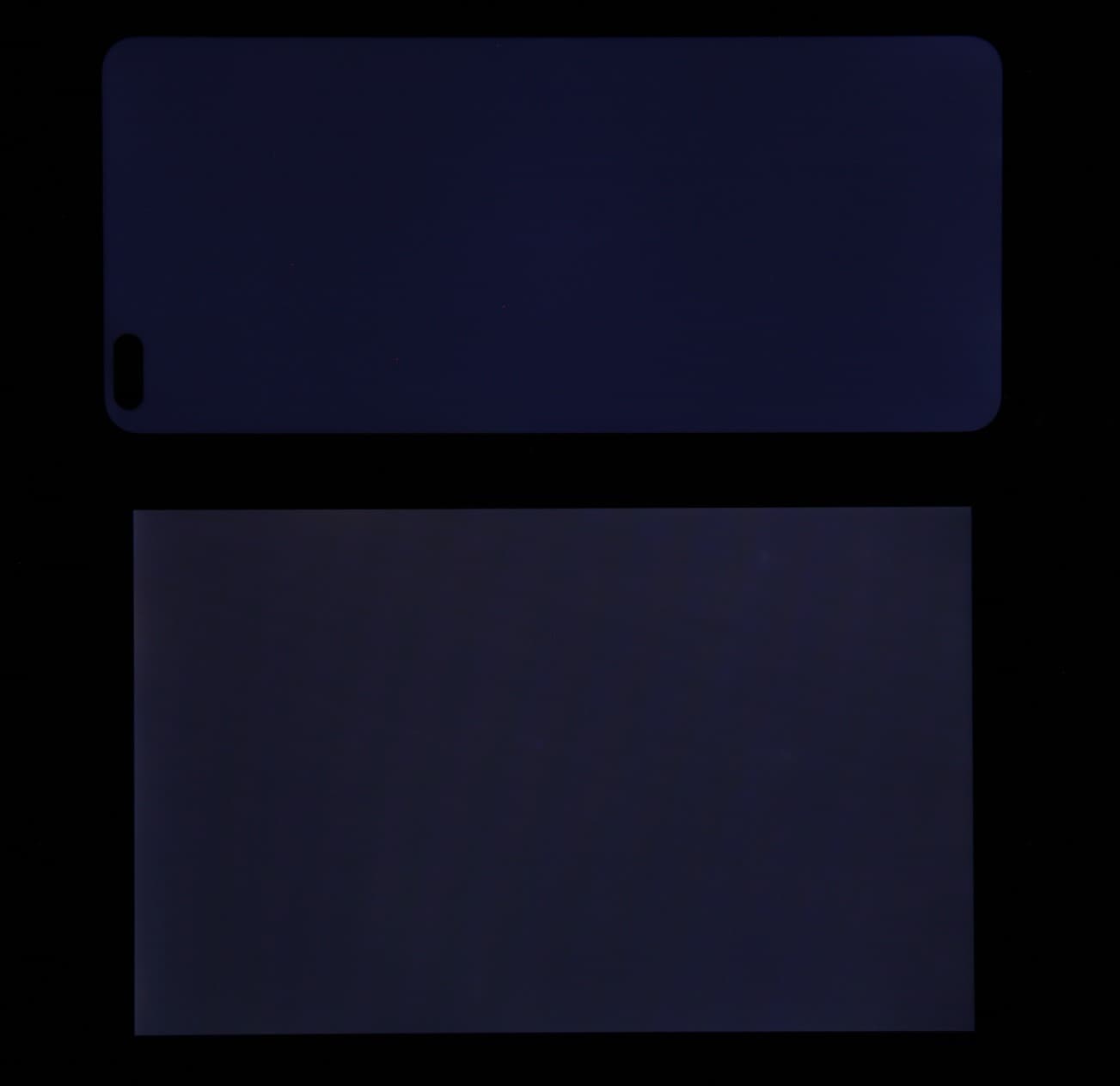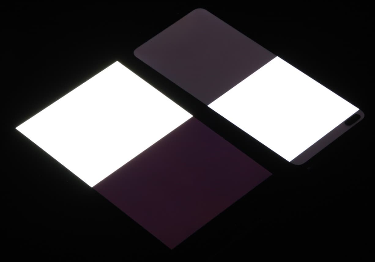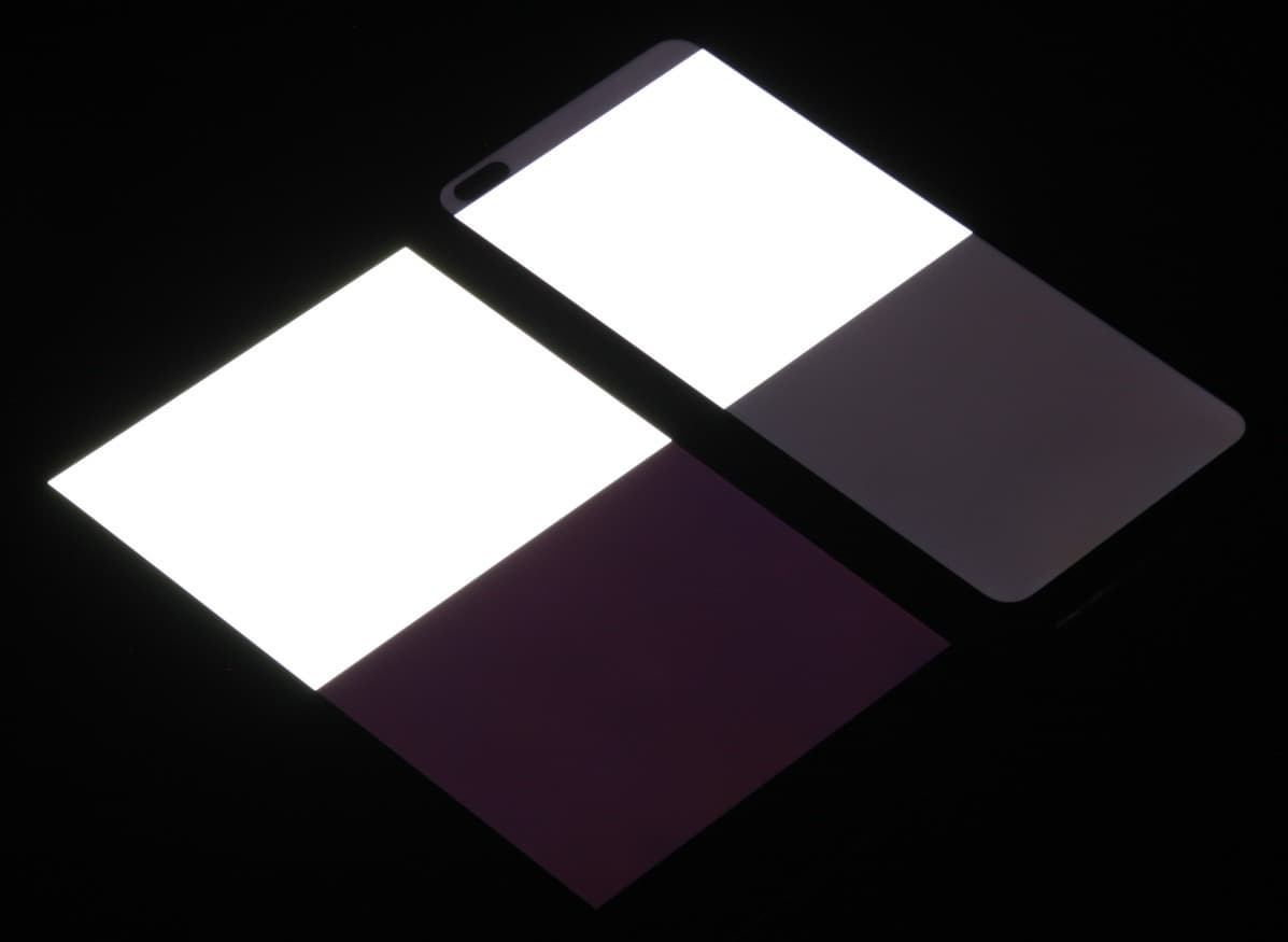 Яркость под углом у экранов уменьшилась (как минимум в 5 раз, исходя из разницы в выдержке), но в случае Infinix Note 8 яркость снизилась сильнее. Черное поле при отклонении по диагонали сильно высветляется, и приобретает слегка красноватый оттенок. Фотографии ниже это демонстрируют (яркость белых участков в перпендикулярном плоскости экранов направлении одинаковая!):