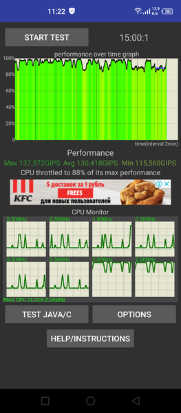 Тестирование традиционно проводилось на обычном уровне энергопотребления без использования функций энергосбережения, хотя таковые в аппарате имеются. Условия тестирования: выставлен минимальный комфортный уровень яркости (примерно 100 кд/м²). Тесты: беспрерывное чтение в программе Moon+ Reader (со стандартной, светлой темой); беспрерывный просмотр видео в HD-качестве (720р) через домашнюю сеть Wi-Fi; игра Injustice 2 с автонастройками графики.