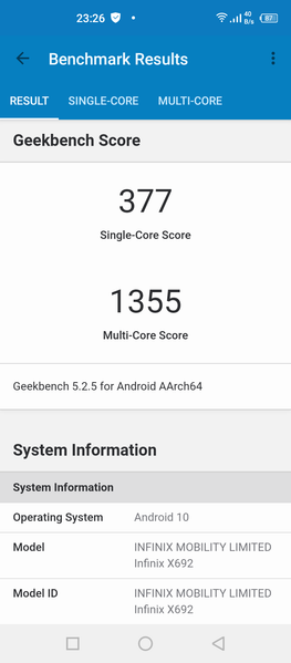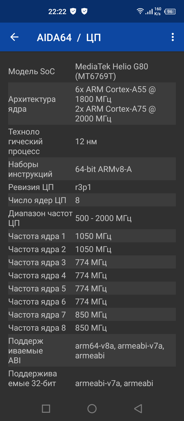 - SoC Mediatek Helio G80, 8 ядер (2×Cortex-A75 @2,0 ГГц + 6×Cortex-A55 @1,8 ГГц)