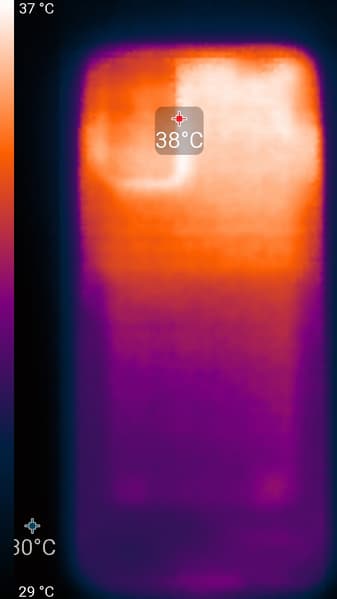 Нагрев выше в верхней части аппарата, что, видимо, соответствует расположению микросхемы SoC. По данным теплокамеры, максимальный нагрев составил 38 градусов (при температуре окружающего воздуха в 24 градуса), это не очень много.