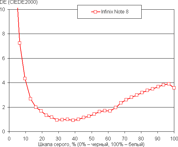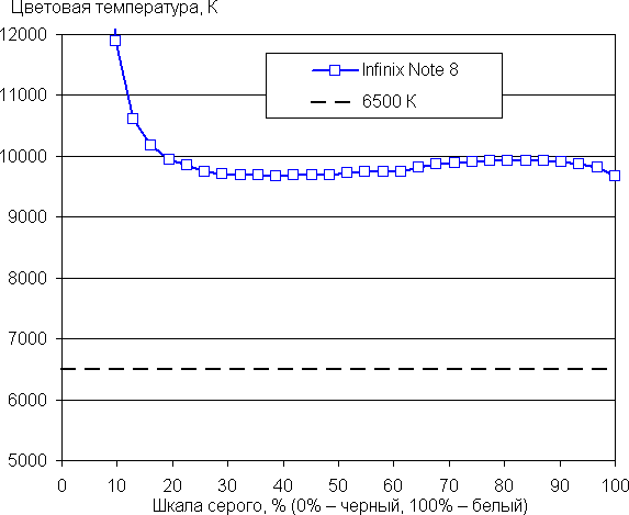 Баланс оттенков на шкале серого компромиссный, так как цветовая температура существенно выше стандартных 6500 К. Однако отклонение от спектра абсолютно черного тела (ΔE) на шкале серого ниже 10, что для потребительского устройства считается приемлемым показателем. При этом цветовая температура и ΔE мало изменяются от оттенка к оттенку — это положительно сказывается на визуальной оценке цветового баланса. (Самые темные области шкалы серого можно не учитывать, так как там баланс цветов не имеет большого значения, да и погрешность измерений цветовых характеристик на низкой яркости большая.)