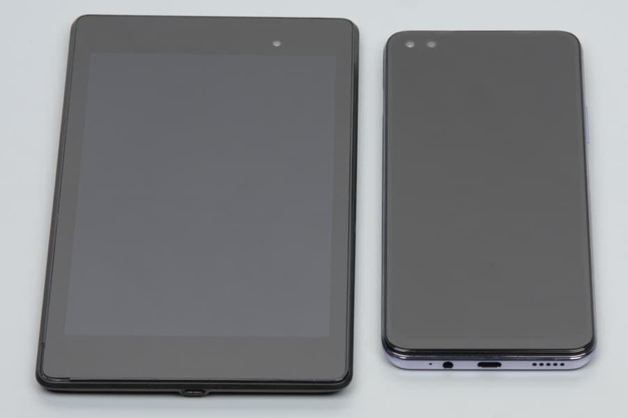 Лицевая поверхность экрана выполнена в виде стеклянной пластины с зеркально-гладкой поверхностью, устойчивой к появлению царапин. Судя по отражению объектов, антибликовые свойства экрана лучше, чем у экрана Google Nexus 7 (2013) (далее просто Nexus 7). Для наглядности приведем фотографию, на которой в выключенных экранах отражается белая поверхность (слева — Nexus 7, справа — Infinix Note 8, далее их можно различать по размеру):
