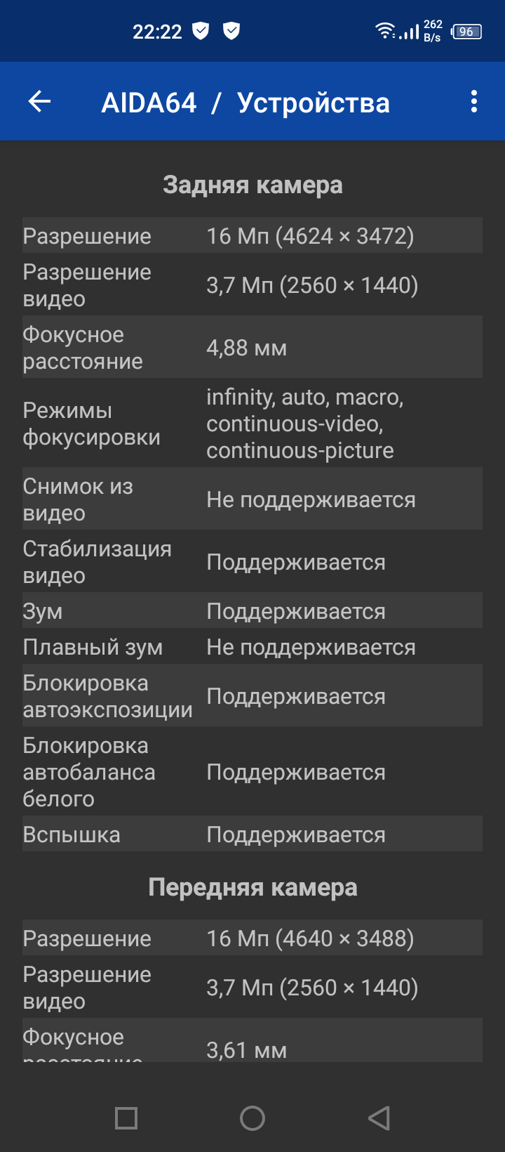 Главная камера вроде как может снимать в разрешении 16 или 64 Мп. Однако при переключении на 64 Мп камера предлагает «держать ее неподвижно», что наводит на мысль об искусственном склеивании нескольких снимков и, возможно, интерполяции. Да и диагностические приложения определяют основной модуль как 16-мегапиксельный. Наименование модуля тщательно скрывается, он не опознаётся ни одной из тестовых программ, включая AIDA64, так что ни подтвердить, ни опровергнуть эти догадки мы не можем.