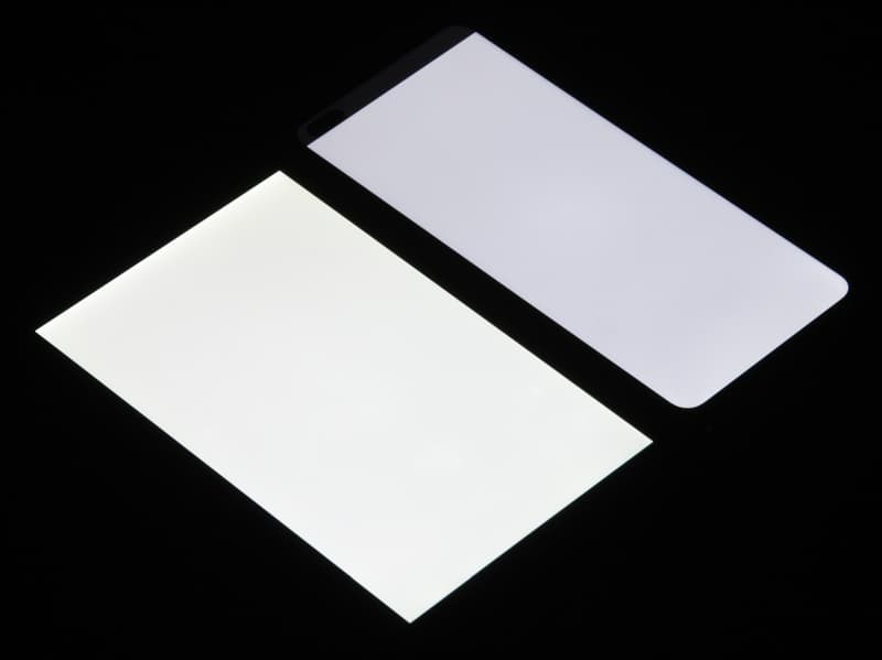 При перпендикулярном взгляде равномерность черного поля хорошая — в паре мест близко к краю черный чуть высветлен (для наглядности яркость подсветки на смартфоне установлена на максимум):