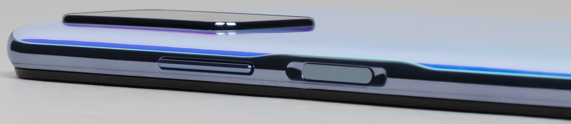 Боковые кнопки установлены на одной грани. В клавишу питания врезана площадка сканера отпечатков пальцев. Надо отметить невероятно быструю скорость срабатывания этого сканера: создается впечатление, что распознавание начинается уже «на подлете» пальца. Решение максимально удобное, и мы рады, что его применяют все чаще: не нужно городить никаких «подэкранных» сканеров.