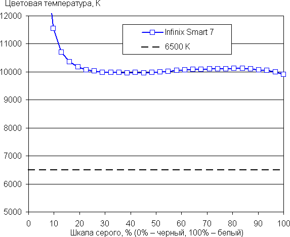 (Самые темные области шкалы серого можно не учитывать, так как там баланс цветов не имеет большого значения, да и погрешность измерений цветовых характеристик на низкой яркости большая.)