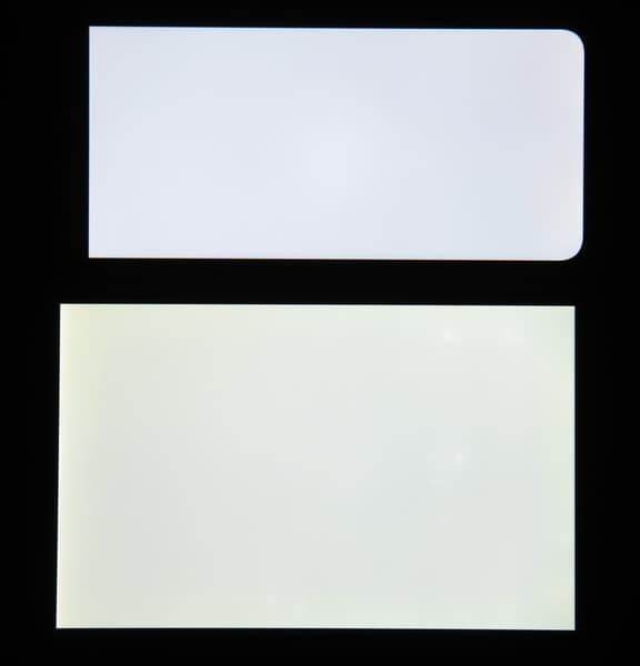 Яркость под углом у экранов уменьшилась (как минимум в 5 раз, исходя из разницы в выдержке), но в случае Infinix Smart 7 яркость снизилась заметно сильнее. Черное поле при отклонении по диагонали заметно высветляется и приобретает красноватый оттенок. Впрочем, именно по значению яркости высветление невысокое, так как оно маскируется сильным снижением яркости экрана под углами. Если ориентироваться на яркость белого под углами, то относительно ее высветление черного сильное. Фотографии ниже это демонстрируют (яркость белых участков в перпендикулярном плоскости экранов направлении одинаковая!):