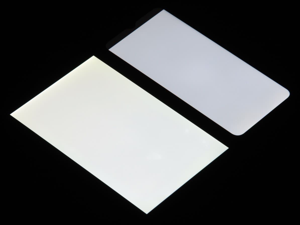 Лицевая поверхность экрана выполнена в виде стеклянной пластины с зеркально-гладкой поверхностью, устойчивой к появлению царапин. Судя по отражению объектов, антибликовые свойства экрана лучше, чем у экрана Google Nexus 7 (2013) (далее просто Nexus 7). Для наглядности приведем фотографию, на которой в выключенных экранах отражается белая поверхность (слева — Nexus 7, справа — Infinix Smart 7, далее их можно различать по размеру):