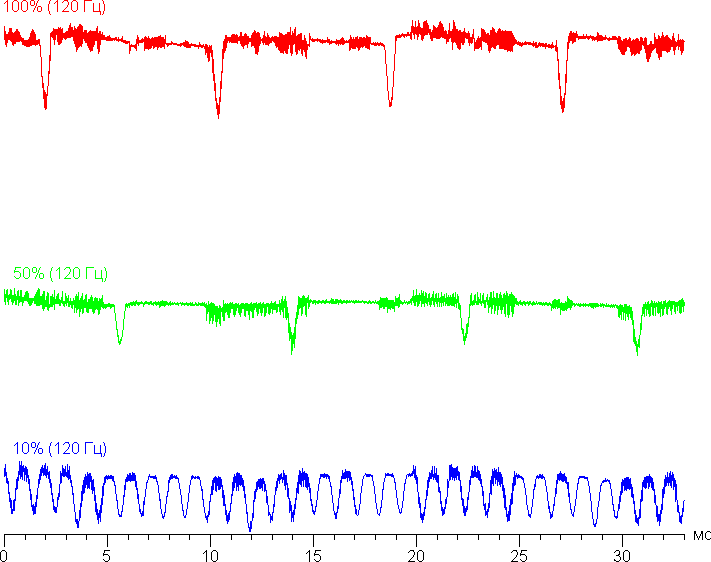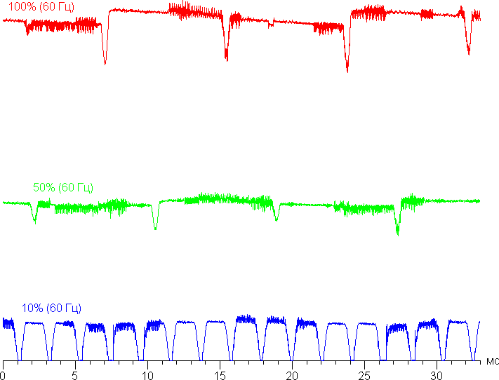 На высоком и среднем уровне яркости присутствует значимая модуляция с частотой примерно 60 или 120 Гц. На рисунке ниже приведены зависимости яркости (вертикальная ось) от времени (горизонтальная ось) для нескольких значений настройки яркости. Сначала для режима с частотой обновления 60 Гц: