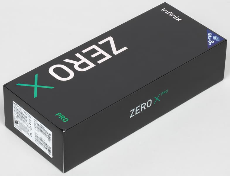 Infinix Zero X Pro поставляется в коробке из твердого картона с лаконичным двухцветным оформлением.