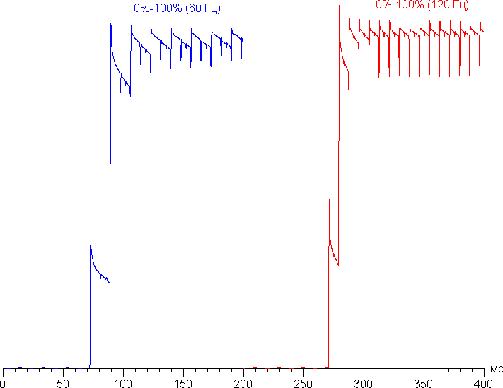 Переключение состояния элементов матрицы выполняется практически мгновенно, но на фронте включения может присутствовать ступенька шириной примерно 17 мс (что соответствует частоте обновления экрана примерно в 60 Гц) или примерно 8 мс (120 Гц). Например, так выглядит зависимость яркости от времени при переходе от черного к белому для режимов 60 Гц и 120 Гц: