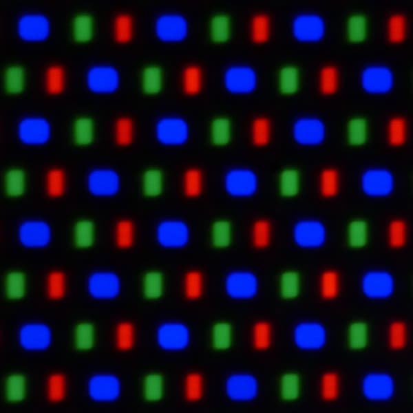 В этом экране используется матрица AMOLED — активная матрица на органических светодиодах. Полноцветное изображение создается с помощью субпикселей трех цветов — красного, зеленого и синего в равном количестве. Это подтверждается фрагментом микрофотографии:
