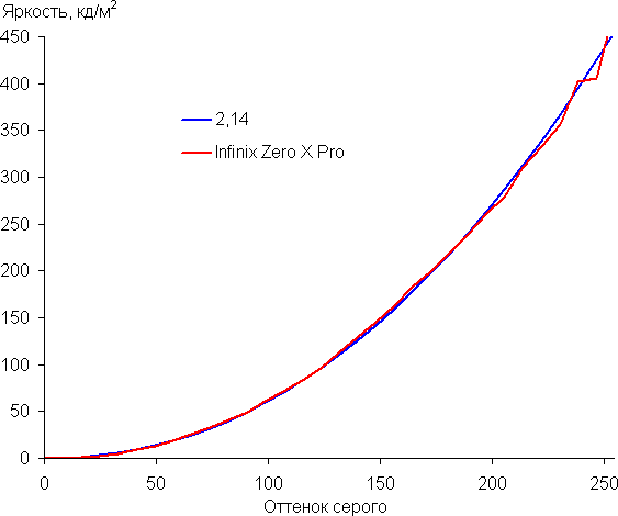 Напомним, что в случае OLED-экранов яркость фрагментов изображения динамично меняется в соответствии с характером выводимого изображения — чуть уменьшается для светлых в целом изображений. В итоге полученная зависимость яркости от оттенка (гамма-кривая), скорее всего, не соответствует гамма-кривой статичного изображения, так как измерения проводились при последовательном выводе оттенков серого почти на весь экран.