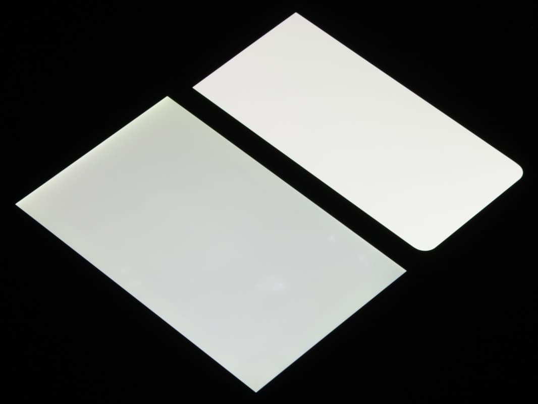 Лицевая поверхность экрана выполнена в виде стеклянной пластины с зеркально-гладкой поверхностью, устойчивой к появлению царапин. Судя по отражению объектов, антибликовые свойства экрана не хуже, чем у экрана Google Nexus 7 (2013) (далее просто Nexus 7). Для наглядности приведем фотографию, на которой в выключенных экранах отражается белая поверхность (слева — Nexus 7, справа — Infinix Zero X Pro, далее их можно различать по размеру):