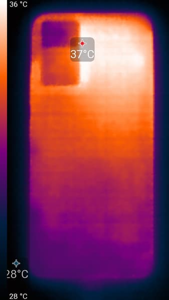 Нагрев больше в верхней части аппарата, что, видимо, соответствует расположению микросхемы SoC. По данным теплокамеры, максимальный нагрев составил 37 градусов (при температуре окружающего воздуха в 24 градуса), это не очень много.