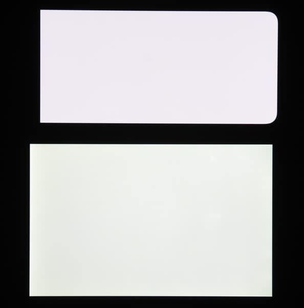 Экран характеризуется великолепными углами обзора. Правда, белый цвет при отклонении даже на небольшие углы приобретает легкий радужный оттенок, но черный цвет остается просто черным под любыми углами. Он настолько черный, что параметр контрастности в данном случае неприменим. Для сравнения приведем фотографии, на которых на экраны Infinix Zero X Pro и второго участника сравнения выведены одинаковые изображения, при этом яркость экранов изначально установлена примерно на 200 кд/м², а цветовой баланс на фотоаппарате принудительно переключен на 6500 К.