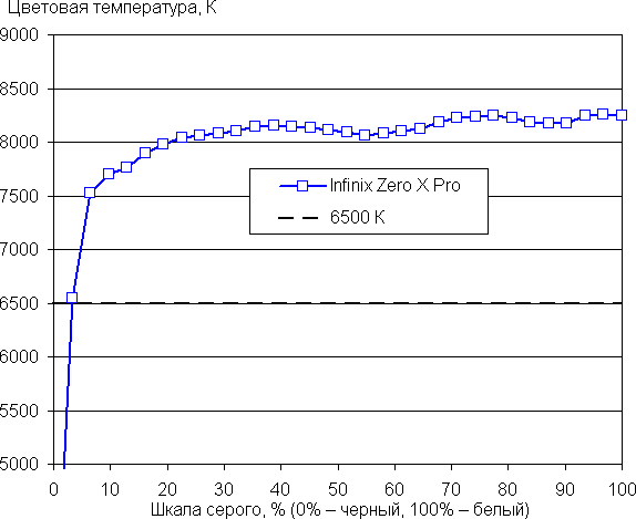 Баланс оттенков на шкале серого компромиссный, так как цветовая температура заметно выше стандартных 6500 К, но отклонение от спектра абсолютно черного тела (ΔE) меньше 10 единиц, что для потребительского устройства считается приемлемым показателем. При этом цветовая температура и ΔE мало изменяются от оттенка к оттенку — это положительно сказывается на визуальной оценке цветового баланса. (Самые темные области шкалы серого можно не учитывать, так как там баланс цветов не имеет большого значения, да и погрешность измерений цветовых характеристик на низкой яркости большая.)