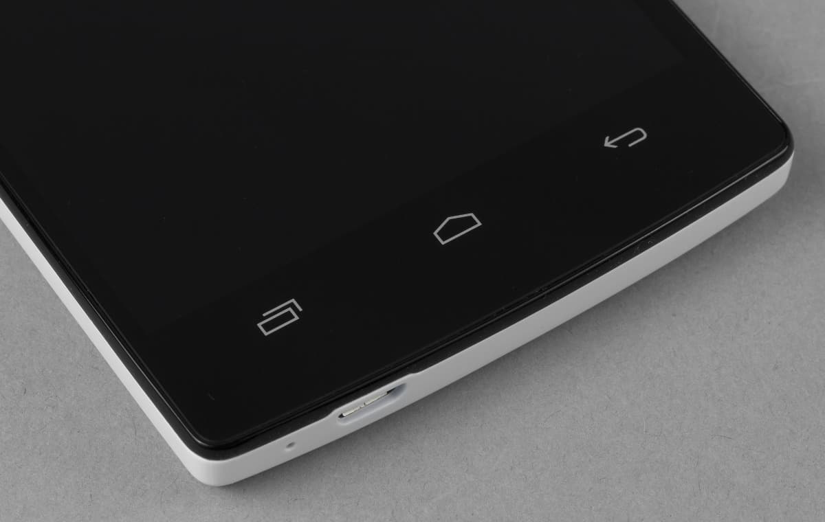 Под экраном находятся три стандартные сенсорные кнопки Android. Их пиктограммы нарисованы белой краской и хорошо заметны. Есть подсветка, которая включается после нажатия на одну из этих кнопок, но яркость свечения у пиктограмм явно существенно разная. Возможно, это особенность китайской сборки, так как логическое объяснение такой разнице найти сложно.