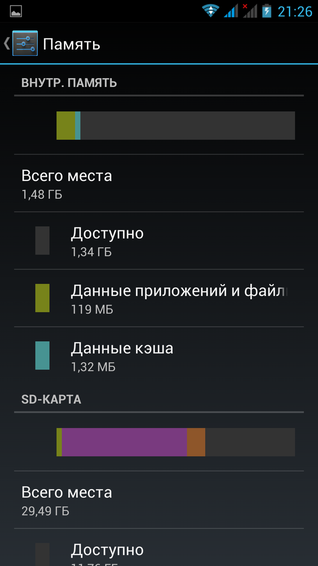 Всего в телефоне есть 4 ГБ флэш-памяти. Из этого объема около 1,5 ГБ отдано для внутренней памяти телефона (для установки программ доступно около 1,35 ГБ), а 1,2 ГБ представлены в виде эмулируемой карты памяти (доступны все 1,2 ГБ). Дополнительно можно (скорее, даже нужно) использовать карты microSD. Поддержки OTG в этой модели нет.