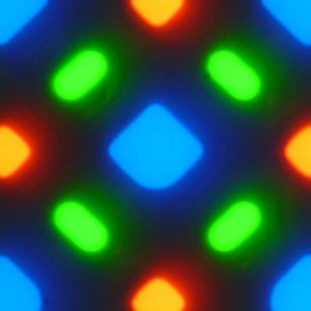В этом экране используется матрица AMOLED — активная матрица на органических светодиодах. Полноцветное изображение создается с помощью субпикселей трех цветов — красного (R), зеленого (G) и синего (B), но красных и синих субпикселей в два раза меньше, что можно обозначить как RGBG. Это подтверждается фрагментом микрофотографии:
