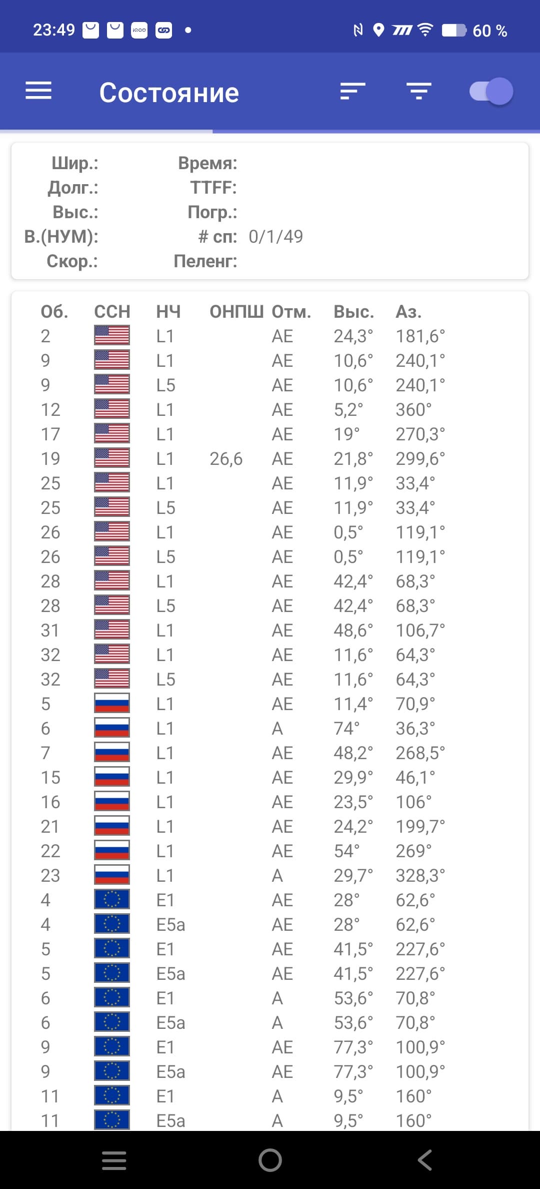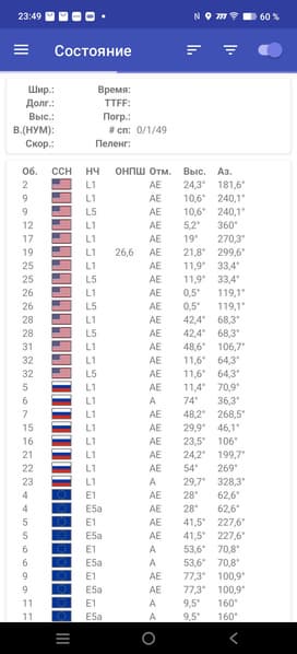 - GPS (L1+L5), Глонасс (G1), BDS (B1I+B1c+B2a), Galileo (E1+E5a), QZSS (L1+L5)