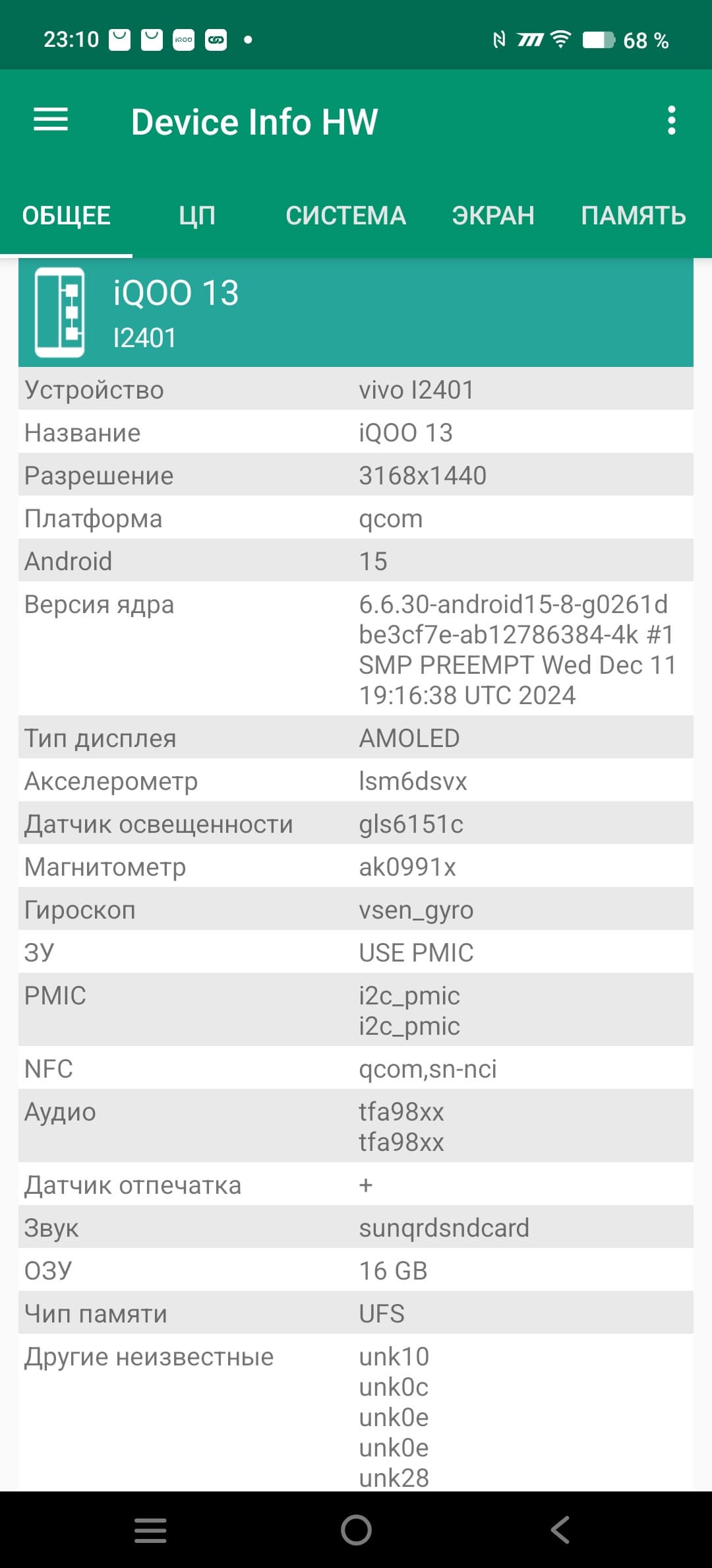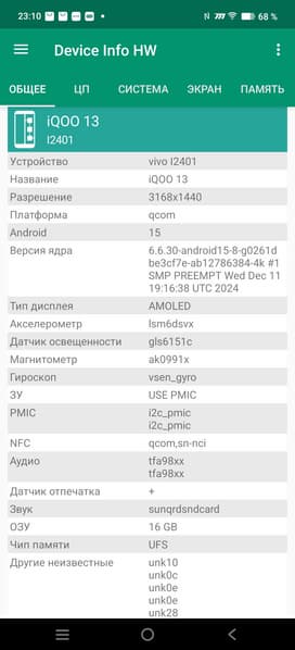 У смартфона iQoo 13 хорошие сетевые возможности: поддерживаются сети вплоть до 5G, два диапазона Wi-Fi 6, Bluetooth 5.4, есть поддержка NFC, но поддержки e-SIM нет. На практике в пределах городской черты московского региона аппарат демонстрирует уверенную работу в беспроводных сетях, не теряет связь, быстро восстанавливает связь после вынужденного обрыва. Все необходимые встроенные датчики, вплоть до гироскопа, на месте, не хватает лишь барометра.