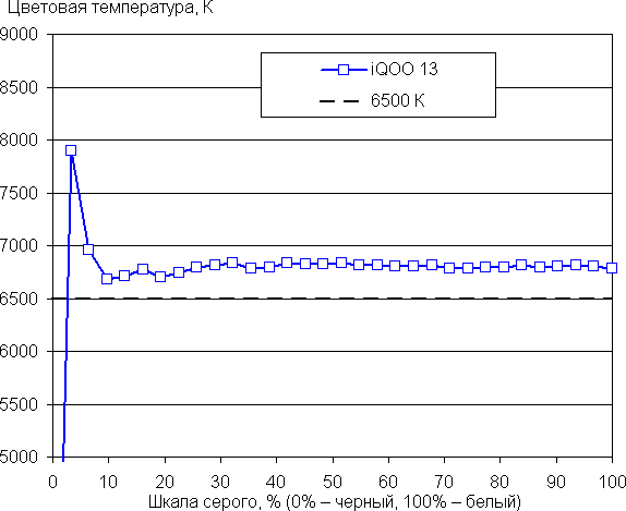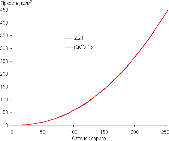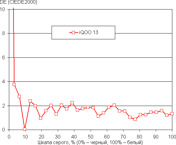 Напомним, что в случае OLED-экранов яркость фрагментов изображения динамично меняется в соответствии с характером выводимого изображения — слегка уменьшается для светлых в целом изображений. В итоге полученная зависимость яркости от оттенка (гамма-кривая), скорее всего, немного не соответствует гамма-кривой статичного изображения, так как измерения проводились при последовательном выводе оттенков серого почти на весь экран.