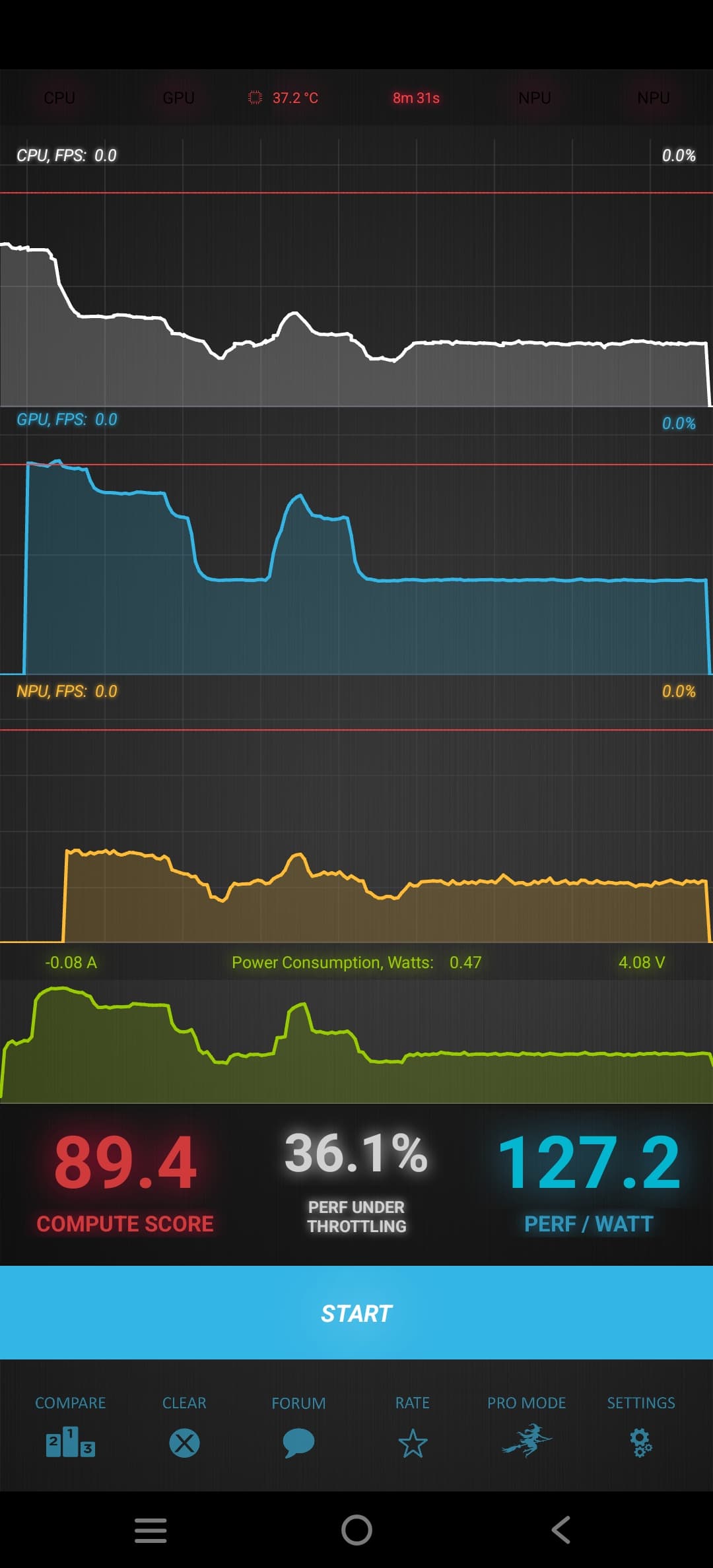 Тест на снижение производительности при нагреве мы проводим с помощью программы Burnout Benchmark, которая позволяет нагружать CPU, GPU и NPU: