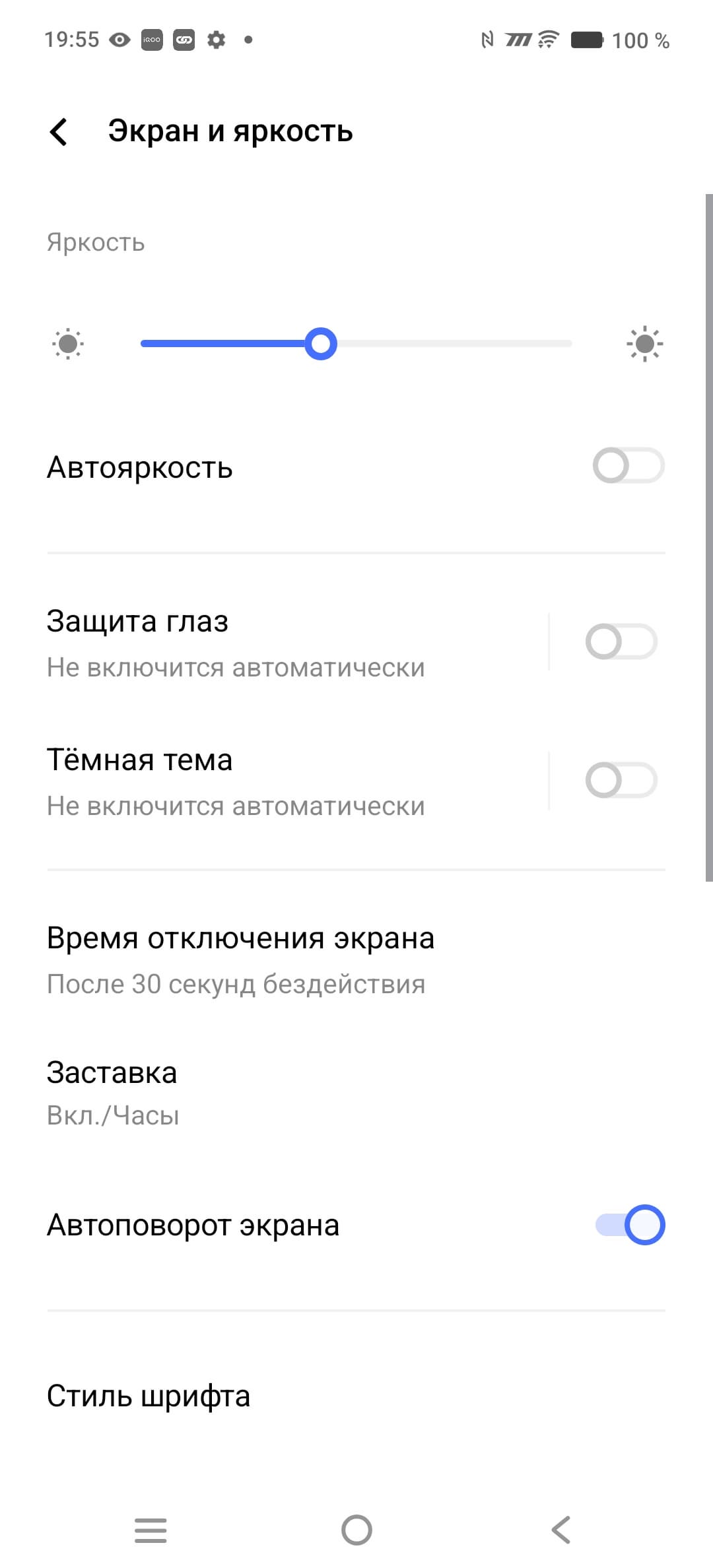 При ручном управлении яркостью и при выводе белого поля во весь экран максимальное значение яркости составило примерно 600 кд/м² в обычных условиях, на очень ярком свету оно может повышаться до 1700 кд/м². Максимальная яркость очень высокая. В итоге, учитывая отличные антибликовые свойства, читаемость днем на солнце, должна быть на хорошем уровне. Минимальное значение яркости при ручном управлении — 2 кд/м², то есть пониженный уровень яркости без проблем позволяет использовать устройство даже в полной темноте. Есть автоматическая регулировка яркости по датчику освещенности (он расположен под экраном близко к верхнему краю правее центра по горизонтали). В автоматическом режиме при изменении внешних условий освещенности яркость экрана как повышается, так и понижается. Работа этой функции зависит от положения ползунка регулировки яркости: им пользователь может попытаться выставить желаемый уровень яркости в текущих условиях. Если оставить все по умолчанию, то в полной темноте функция автояркости уменьшает яркость до 3 кд/м² (темновато), в условиях освещенного искусственным светом офиса (примерно 550 лк) устанавливает на 90 кд/м² (сойдет), а условно под прямыми лучами солнца повышает до 1700 кд/м² (до максимума, так и нужно). Результат нас не совсем устроил, поэтому в полной темноте мы чуть увеличили яркость, получив в итоге для трех условий, указанных выше, следующие значения: 14, 100 и 1700 кд/м² (идеальное сочетание). Получается, что функция автоподстройки яркости работает адекватно и позволяет пользователю настраивать свою работу под индивидуальные требования.